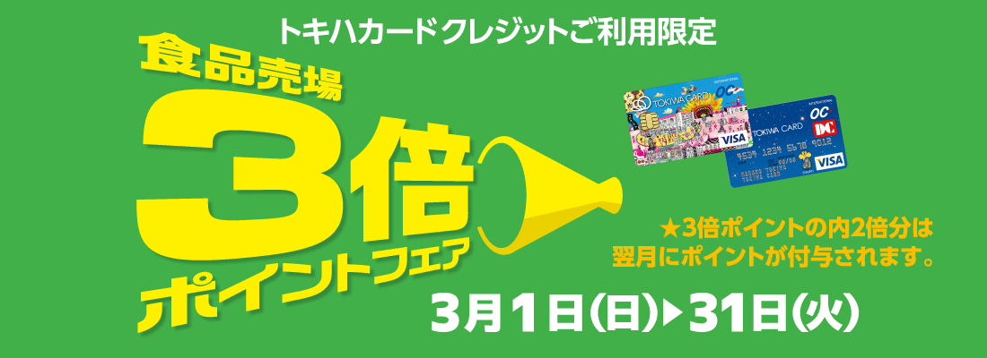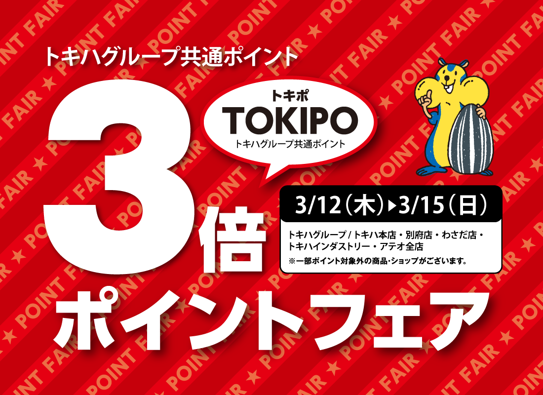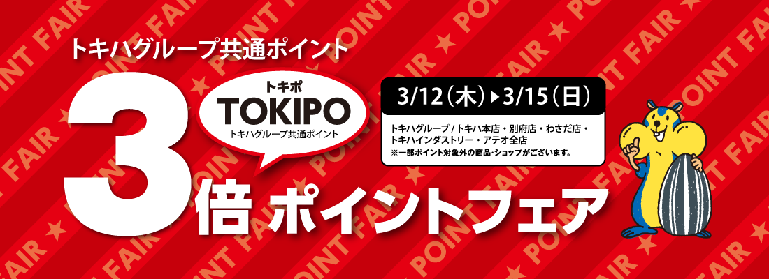 ■トキハ本店/全館(※テナントは対象外) ※一部対象外の商品・ショップがございます。■3/12(木)~3/22(日) 11日間上記期間中、通常のポイント1倍(本体価格100円につき)に加えチャージ金利用額に対して、100円につき『+2ポイント』を加算し付与致します。【付与日】通常ポイントは、リアルポイントとしてお買上と同時に付与いたしますが、チャージ金利用額に対しての+2ポイント分は、2日後に付与いたします。