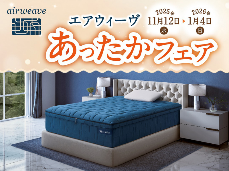 ■ 11/12(水) ~ 1/4(日)冬の心地よさをお届けするエアウィーヴのあったかフェア開催中。期間中ご成約に限り、配送料・設置料・引き取り料はエアウィーヴがご負担いたします。ぜひこの機会に、買い替えをご検討されてみてはいかがでしょうか。