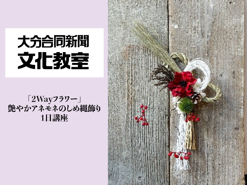■わさだタウン3街区フェスティバルタウン1F 大分合同新聞文化教室■お申込み受付中 ▶︎ 11月25日(火)までアートフラワーで作るしめ縄。紅いアネモネが年末年始を艶やかに彩ります。初心者OK!お好きな形にアレンジ可能です。【開催日時】12月2日(火) 14:00~15:30【受講料】 1,650円【教材費】 3,300円【定 員】 6名【講 師】 日本プリザーブドフラワー協会ディプロマ資格 此の花さくやAkemi※締め切り日以降のキャンセルはできません。※事前のお支払いが必要です。※お持ち帰り用の袋とスリッパをご持参ください。<お問合せ>大分合同新聞文化教室わさだタウン教室 TEL:097-541-0481