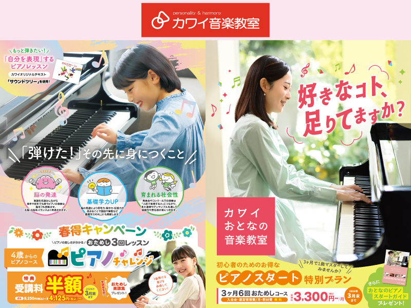 ■わさだタウン2街区1F/外周1丁目 カワイ音楽教室こんにちは♪カワイ音楽教室です。新春・・・何か新しく始めたくなる季節ですね。さぁ、わったんでピアノはじめてみませんか?無料体験・おためしレッスン受付中です♪☆おためし3回レッスン ピアノチャレンジ ≪2026年3月末まで≫~今大人気!1か月で簡単な曲が弾けるように・・・“はじめてのお子様”のための3回個人レッスン~お子様がピアノに興味を持つか不安・・・まずは、おためし個人レッスンから初めてみませんか?1か月間のおためし3回レッスンにより、お子様がピアノを続けていけるかを判断できます。60年以上のノウハウを詰め込んだオリジナルテキスト「サウンドツリー」でお子さまの成長にとって「何が必要か」を常に考えたレッスンを行います。●受講料…特別価格 4,125円さらに、おためしレッスン終了後、正規ご入会で入会金半額!☆3歳ソルフェージュ ≪2026年3月末まで≫3歳からピアノを始めたい方へ!初歩のピアノレッスンで音楽的な基礎を楽しく身につけます!●ご入会の方限定 入会金半額☆大人ピアノスタート特別プラン≪2026年3月末まで≫3か月で1曲マスターしてみませんか?3か月6回のお得なおためしレッスンです●受講料…3,300円/月 ※運営管理費 無料/月さらに、おためしレッスン終了後、正規ご入会金無料!受講者の方全員に「おとなのピアノスタートガイド」をプレゼント。ピアノコース以外にもバイオリンや声楽、いきいきピアノなどのグループコースも。是非一度カワイ音楽教室HPをご覧ください。※無料体験・おためしレッスンの申し込みは《カワイ音楽教室》WEBなら24時間受付中。※教室によって実施コースが異なる場合があります。詳しくはお問い合わせください。【お問合せ】 カワイ音楽教室 大分事務所TEL:0120‐74‐7009 [受付時間]火曜~土曜日 10:00~15:00