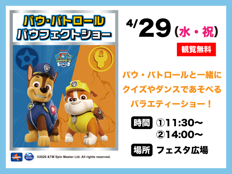 【開催日】4月29日(水・祝)【時 間】①11:30~ ②14:00~【場 所】フェスタ広場 雨天中止・観覧無料 ※観覧人数を制限させていただきます。イベント当日10:00~会場前にて入場整理券を配布します。※1回30分程度のバラエティーショーです。※ショー終了後にお見送りはございません。※諸般の事情により、時間・内容が変更・中止となる場合があります。予めご了承ください。※整理券がなくなり次第、受付は終了となります。▼入場整理券について※会場への入場の際、入場整理券が必要です。※イベント当日朝10:00よりフェスタ広場前にて入場整理券を配布します。※全席指定で入替制の椅子席となります。お子様も1脚ずつお座りください。一人で座れない小さなお子様は大人の膝の上にのせてご観覧ください。手荷物は最小限にして、椅子の下、または足元に置いてください。一部、2F回廊・3F回廊のお席もございます。※入場整理券はお一人様につき、いずれかの回のご家族の人数分最大5名分までお渡しします。別の回の観覧もご希望される場合は、再度最後尾にお並びください。※お友達等ご家族以外の方の分に関して入場整理券をお渡しすることはできません。※入場整理券には席の番号を記載しており、お渡しする順番に前列より詰めてご案内いたします。※席の位置に関してのご希望、また、席の変更は一切受け付けられません。ご了承ください。※フェスタ広場(1F)分の配布終了後、2Fの回廊、3Fの回廊の順で配布します。※1回目公演分の配布が終了後、2回目公演分を配布します。※入場整理券の交換・譲渡・販売はできません。※入場整理券配布が終了した時点で受付は終了となります。▼会場注意事項※全席指定で入替制の椅子席となります。椅子以外のエリアに場所を取ることはできません。フェスタ広場(1F)の会場は必ず椅子に座ってご観覧ください。2F・3Fの回廊席は、椅子の前に立って、またはお子様を抱いての観覧は構いませんが、お子様を椅子の上に立たせたり、手すりの上に乗せることは大変危険ですのでおやめください。※安全確保の観点から、椅子の間隔をとって並べております。また、避難路を確保しておりますので、椅子の位置は動かさないでください。※体調のすぐれない方は、入場をご遠慮ください。※ベビーカーの会場内への持ち込みはご遠慮ください。会場後方にベビーカー置場(テント)をご用意いたします。紛失・盗難等の責任は負いかねますので、貴重品は必ずお手元にお持ちください。※手荷物・レジャーシート・その他を使用しての場所取り行為は、全てのエリアで禁止といたします。発見次第、スタッフ及び警備員により随時撤去させていただきます。※開場は各回ともに、ショー開始30分前を予定しております。※入場後は原則会場外には出られません。急用の場合は、入場整理券を必ずお持ちになり、スタッフにご提示ください。※会場は屋外です。急な雨天の場合、傘を使用してのご観覧はできません。レインコート等の雨具を各自でご用意ください。※他の方の観覧の妨げとなるため、公演中のつばの広い帽子や日傘・雨傘の使用はご遠慮ください。※上演中の写真・動画の撮影は構いませんが、SNSへのアップロードや他人への送付は禁止します。また、画像・動画に他のお客様が映らないよう細心の注意をお願いします。※会場内の飲食は禁止です。水分補給は構いません。※会場および施設内は原則禁煙です。喫煙所でのみ喫煙可能です。※一般のお客様が多く通行される場所となりますので、通路確保にご協力をお願いします。▼最後に※天候等により、急遽、観覧条件や内容の変更、または中止になる場合がございますので、イベント前日、また、直前にもう一度、トキハわさだタウンHPにてご確認ください。※以上すべて皆様が安全にご観覧いただくためのお願いです。守っていただけない方がいた場合、イベントを中止する事がございます。予めご了承ください。2026.04.13