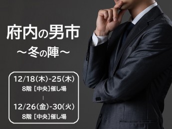 ■ 12月18日(木) ~ 12月30(火)■ 8F 中央 催し場冬への衣替えシーズンにむけて紳士アイテムのフルラインアップを取り揃えた「府内の男市 冬の陣」を開催いたします。ビジネスマンご用達の秋冬物スーツをはじめ、男の身だしなみに欠かせない洋品雑貨各種に秋の行楽で着こなせるカジュアルアイテム、またスポーツウェア、シューズまで特別ご奉仕価格にてご用意しております。ぜひこの機会にお立ち寄りください。< 特別奉仕品の一例 >・紳士スタイリッシュスーツ(サイズ・色柄各種) 19,800円から・紳士ジャケット(インポート生地使用含む) 27,500円ほか・ワイシャツ、ネクタイ(色柄各種) 3,300円から・紳士靴(ビジネス・カジュアル) 11,000円ほか《有名ブランド・メーカー》・カジュアルウェア(アウター・シャツほか) 5,500円ほか・スポーツウェア、フィットネス、スニーカー各種 5,500円ほか...その他 紳士肌着、用品各種も取り揃えております。
