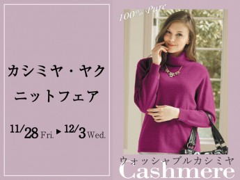 ■わさだタウン2街区2F/中央通り5丁目 特設会場■11月28日(金) ▶︎ 12月3日(水)洗えるカシミヤシリーズをはじめ、ヤク・フォックスなどの獣毛系ニットを幅広くご提案させていただきます。特にホワイトピュアカシミヤは、美しい毛並み、光沢感、最高の手触り感を出すために、良質の水に濡らしながら幾度も起毛を繰り返し、通常の何倍もの時間と人の手を経て製造された上質なカシミヤニットです。手洗い可能で、洗濯してもカシミヤ特有の柔らかな手触りはそのまま。何度もご着用いただけるニットです。カシミヤならではの発色、きめ細やかな肌触り、軽くて優れた保湿性をお楽しみください♪<商品の一例>●《ブローディア》ホワイトピュアカシミヤハイネック(40)…18,700円●《ブローディア》ホワイトピュアカシミヤカーディガン(40)…19,800円●《エグランテーヌ》ヤクピンタックニット(38)…25,300円●《ブローディア》ロゴ刺繍プルオーバー(40)…31,900円