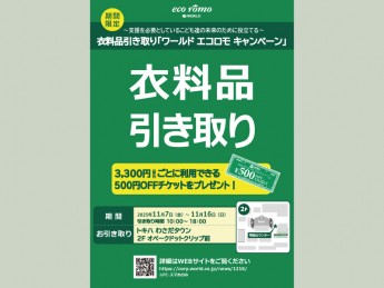 ■わさだタウン2街区2F/中央通り5丁目 特設会場ご不用になった下記の対象品を引き取り会場へお持ちください。◆対象品:衣料品・バッグ・帽子・マフラー・ストール・ベルト・ネクタイ※ワールド製品以外の衣料品もお引取りいたします。上記対象品をお持ちいただいたお客様は1点につき、すぐに使える「500円OFFチケット」にお引き換えいたします。チケットは3,300円(税込)のお買上げごとに1枚ご利用可能です。例えば、6,600円(税込)のお買物ならチケット2枚ご利用で1,000円もお得!■引き取り期間 2025年11月7日(金)〜11月16日(日)■引き取り時間 10:00~18:00■OFFチケットご利用期間 2025年11月7日(金)〜12月7日(日)※1回の引き取り枚数には上限はありませんが、500円OFFチケットの引き換えは、お1人10枚が上限となります▼エコロモキャンペーン詳細は、こちらをご確認ください。引き取りについての注意事項などキャンペーンの詳細を確認していただけます。http://corp.world.co.jp/news/1216/