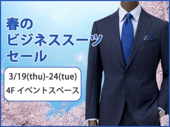 ■ 3月19日(木)~24日(火)■ 4F イベントスペース春からの新生活におすすめのスーツやビジカジセットアップなど、軽くて動きやすいカジュアルなストレッチスーツから、世界中のエグゼクティブから愛されるエルメネジルドゼニアやロロ・ピアーナ社の高級生地を使用したスーツまで豊富な品揃えとサイズ取り揃えました。どうぞこの機会にお立ち寄りください。<一例>・ストレッチカジュアルスーツ(ウォッシャブル)19,800円(クールドッツ生地使用)27,500円・スタイリッシュスーツ(フレッシャーズ)27,500円・スリーピーススーツ(ベスト付)27,500円・インポート生地使用スーツ(VITALE BARBERIS CANONICO ヴィターレ・バルベリス・カノニコ)39,600円~(Loro Piana ロロ・ピアーナ)59,400円~(Ermenegild Zegna エルメネジルド・ゼニア)69,300円~