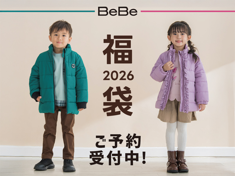 ■ 10/1(水) ~ 12/24(水)■ 6F BeBe毎年、大人気のBeBe(ベベ)の福袋のご予約受付をスタートしました。数に限りがございますので、どうぞお早めに!※取扱いサイズ:男女児 90~150cm※商品お渡し期間:12/27(土) 10:00~※お渡し場所:6F BeBe※電話予約も承ります。(トキハ本店 BeBeショップ直通:097-532-1645)