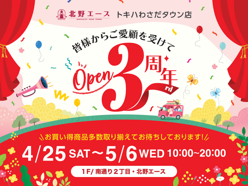 ■わさだタウン2街区1F/南通り2丁目 北野エース■4月25日(土) ▶︎ 5月6日(水・振)北野エースにて、オープン3周年を記念して特別セールを開催しております!お買い得商品を多数取り揃えておりますので、是非ご来店ください。〈商品の一例〉●《アマノフーズ》即席おみそ汁(よりどり12点)…1,039円●《MCC》スープ(よりどり5点)…939円●《北野エース》おすすめお菓子のハッピーバッグ(4点入り)…1,139円●《丸井スズキ》バウムクーヘンセット(3点入り)…1,039円