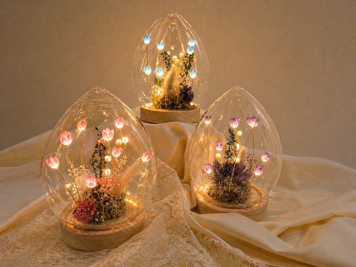 やさしい光に包まれた、特別なフラワーギフトチューリップモチーフのLEDライトと、繊細なプリザーブドフラワーを丁寧にアレンジし、上品なグラスに閉じ込めました。ひとつひとつ手作業で仕上げたハンドメイドのフラワーアレンジは飾るだけで心がふっと和らぎます。リラックスタイムの灯りとして、ベッドサイドのインテリアとしてもおしゃれに寄り添う。母の日にぴったりの贈り物です。LEDフラワーアレンジ 卵型 3,520円