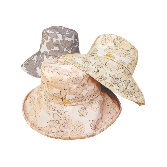 花柄がポイントの一級遮光帽子。お洒落かつ手をあけたまま日差し対策ができる逸品です。
