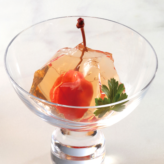 宝石のように美しいぜりぃの中には、甘さすっきりと蜜漬けされたさくらんぼ。お口にさくらんぼの爽やかな甘さがいっぱいに広がります。