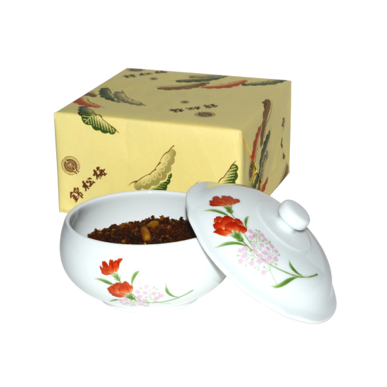 山海の素材で作り上げるふりかけの錦松梅。美しい白磁にカーネーションとかすみ草をデザインした有田焼容器に入れてお届けいたします。