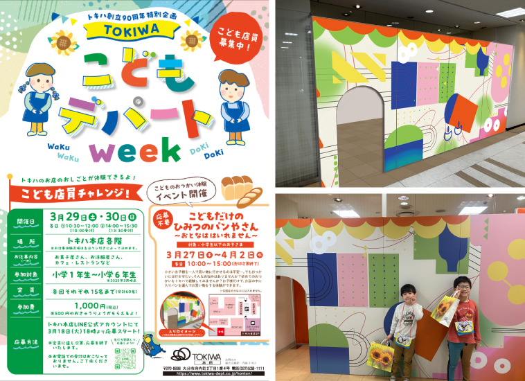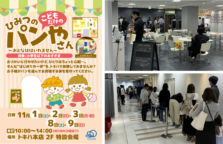 おつかいに行かせたいけど、ひとりはちょっと心配・・・。そんな”はじめての一歩”を、トキハで体験体験するパンやさんを2日間限定で開催。雨の中来てくれるのか不安でしたが、開店と同時に多くのご来店いただきました。お母さんが好きなパン、お父さんが好きなパンと自分で選び、お金の計算を一生懸命している姿が印象的でした。