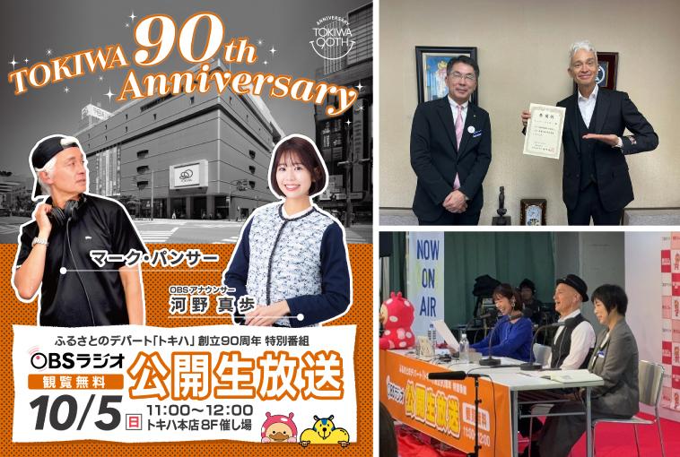 10時の開店にあわせ本店正面玄関にて、お客様を笑顔でお迎えし、11時から8F催し場で、OBSラジオ特別番組「ふるさとのデパート トキハ 創立90周年特別番組」の公開生放送を実施。番組内では、リスナーから「トキハといえば」の思い出を募集・紹介したほか、トキハにまつわるクイズも出題されトキハの思い出を一緒に振り返りました。