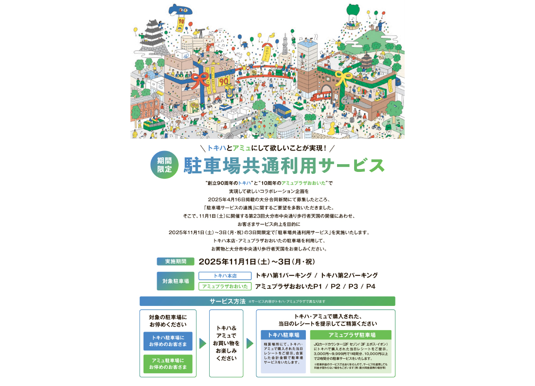 「トキハとアミュにして欲しいこと」の募集の中から多くご要望をいただきました駐車場共通利用サービスの第二弾。「第23回大分市中央通り歩行者天国」の会期に合わせて実施。トキハ&アミュでお買い物いただいた当日レシートをご提示いただき、合算金額に応じて駐車サービスを行いました。