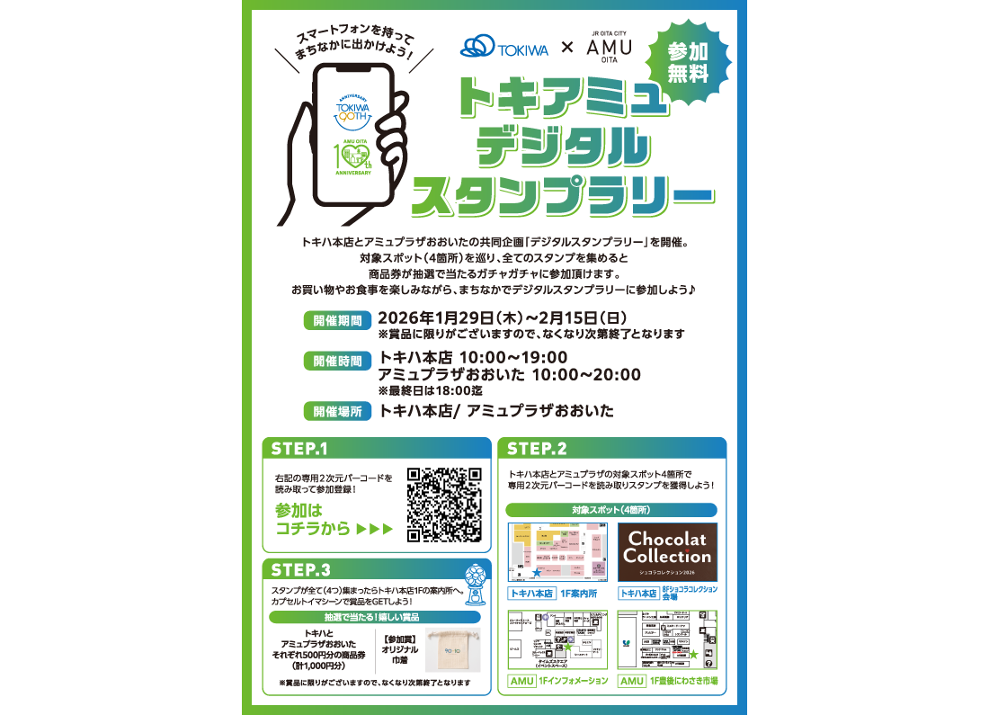 トキハ本店とアミュプラザおおいたは、まちなかの回遊キャンペーンとしてデジタルスタンプラリーを開催。