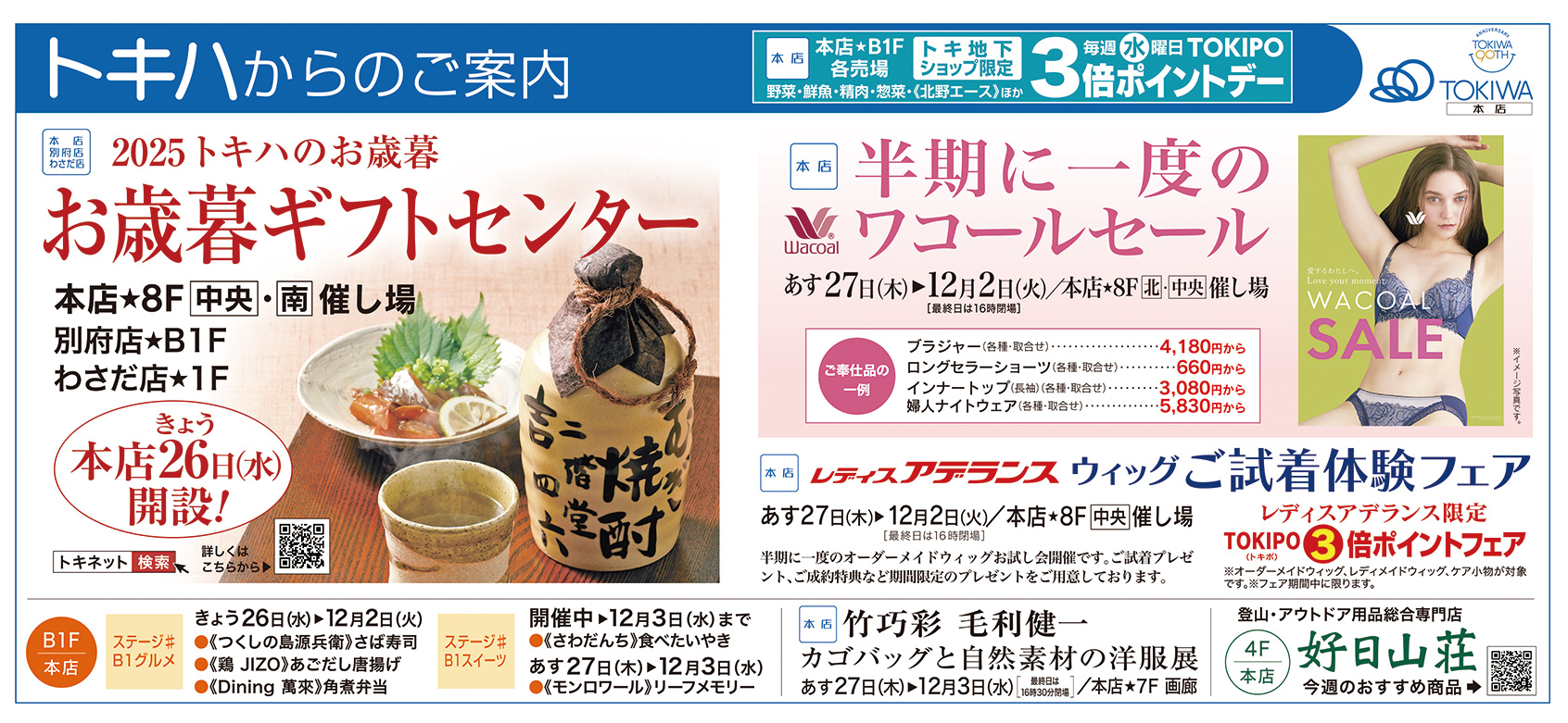 ・お歳暮ギフトセンター 本店8F中央・南催し場、別府店B1F、わさだ店1F・半期に一度のワコールセール あす27日(木)~12月2日(火)、本店8F北・中央催し場・レディスアデランス ウィッグ ご試着体験フェア あす27日(木)~12月2日(火)、本店8F中央催し場