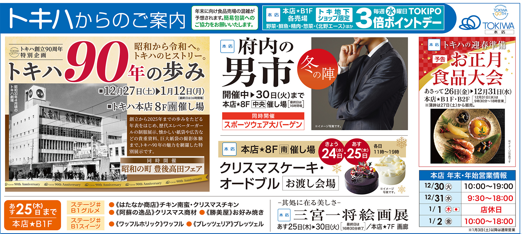 ・トキハ創立90周年特別企画 トキハ90年の歩み 12月27日(土)~1月12日(月)/本店 8F催し場/最終日は16時閉場・府内の男市 冬の陣 開催中~30日(火)/本店 8F催し場/最終日は16時閉場・クリスマスケーキ・オードブル お渡し会 きょう24日(水)・あす25日(木)/本店 8F催し場/各日11時~19時・お正月大会 あさって26日(金)~31日(水)/本店 B1F・B2F/※12月31日(水)は9時30分~18時営業
