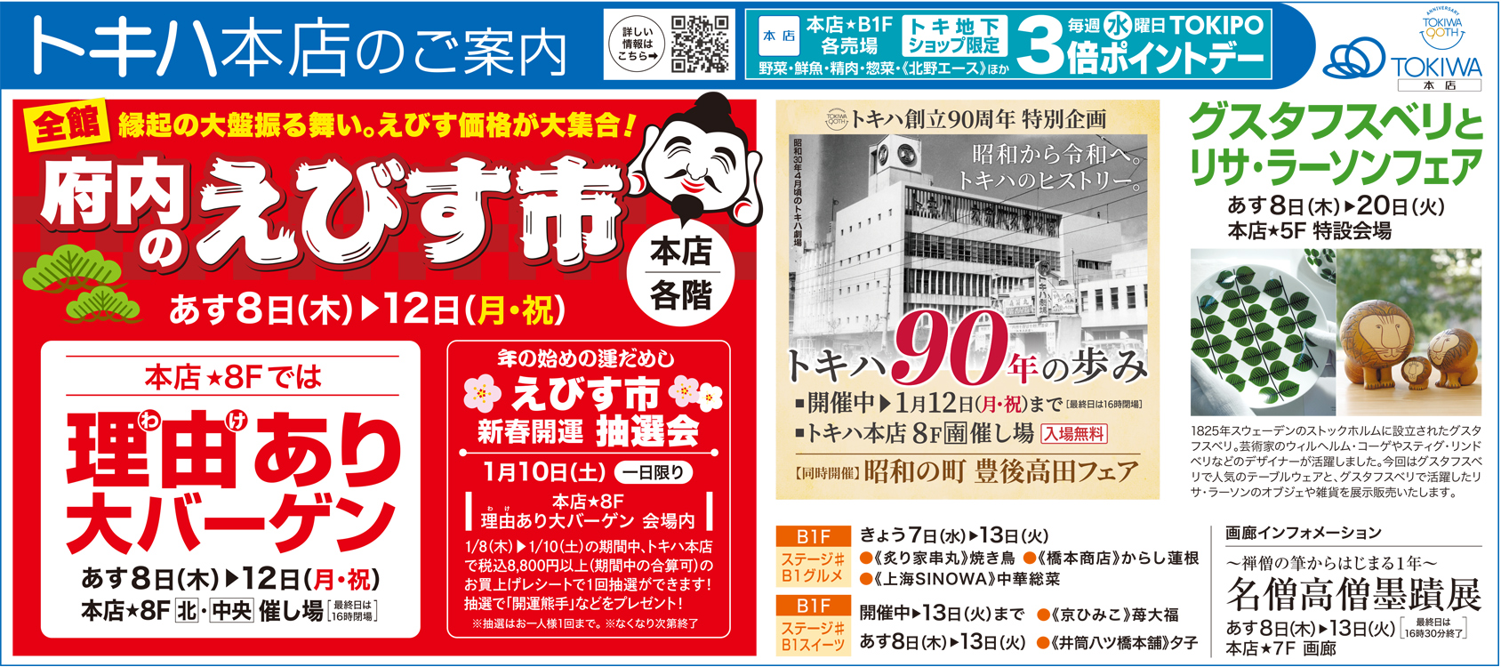 ・府内のえびす市 あす8日(木)~12日(月・祝)/本店 各階・理由(わけ)あり大バーゲン あす8日(木)~12日(月・祝)/本店 8F 催し場/最終日は16時閉場・トキハ創立90周年特別企画 トキハ90年の歩み 開催中~1月12日(月・祝)/本店 8F催し場/最終日は16時閉場・グスタフスベリとリサ・ラーソンフェア あす8日(木)~20日(火)/本店 5F特設会場
