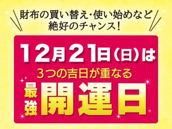 ■わさだタウン2街区1F/中央通り6丁目 財布売場12月21日(日)は最強開運日!財布の買い替え、使い始めなど絶好のチャンスです!【天赦日】 「天が万物の罪を赦す(許す)日」。年に5回または6日ほどしかない貴重な大吉日。【一粒万倍日】 「一粒の籾(もみ)が万倍もの稲穂になる」とされ、物事を始めるのに良いといわれています。【甲子の日】 60日に一度訪れる開運日。縁起が良く物事を始めるのに良い日といわれています。