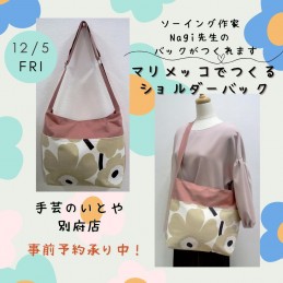 ソーイング作家Nagi先生による製作体験会のお知らせです。マリメッコ生地でNagi先生のショルダーバッグを作成します。どこにも売っていない、自分だけの「マリメッコショルダーバッグ」を作りませんか?素材はカット済みで、後は縫うだけの楽しい体験会です。初心者さんにオススメ!マリメッコ以外の生地でも作れます!<日時>12月5日(金) 10:30~13:00<場所>トキハ別府店 東館4F 手芸のいとや<料金>講習料 3,000円 + 材料費(マリメッコ 約6,452円 選んだ生地で変わります)※準備が必要な為事前のご予約と材料のご購入をお願いいたします。※ご予約は店頭又はお電話にて承ります。トキハ別府店 手芸のいとや 0977-26-6614