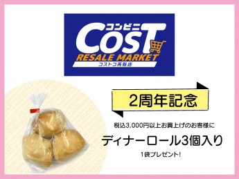 ■わさだタウン2街区1F/南通り7丁目 コンビニコスト■1月6日(火) ▶︎ 1月12日(月・祝)コンビニCOST「OPEN 2周年」記念!期間中、税込3,000円以上お買上げのお客様に“ディナーロール3個入り”を1袋プレゼントいたします。※数量限定のため無くなり次第終了となります。