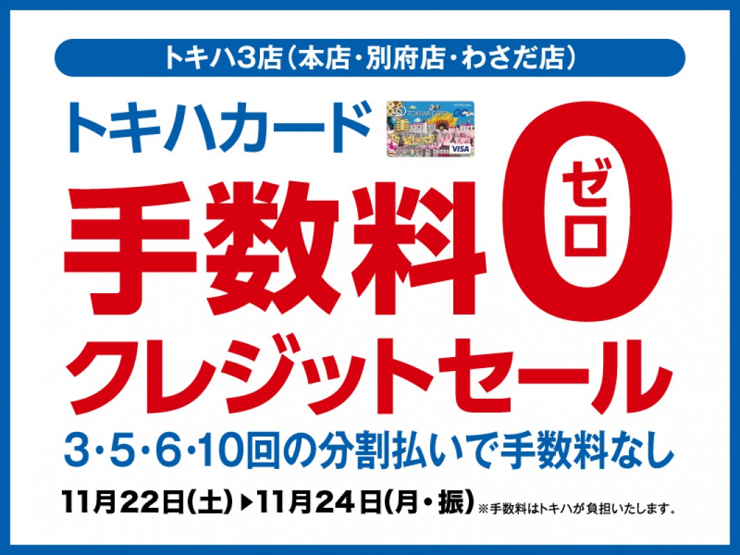 \トキハカード手数料ゼロクレジットセール/■ 11/22(土) ~ 11/24(月・振)■トキハ本店・別府店・わさだ店期間中、トキハカード・トキハカスタマーカードをご使用してお買物いただくと、「3・5・6・10回払いで、手数料が0円になります!」おトクな期間となっておりますので、ぜひご利用ください!(例)「税込10,000円」の商品を「6回払い」でご購入いただいた場合 初回 1,700円 2回 1,660円 : 6回 1,660円 計10,000円※一回のお支払い金額が1,000円(税込)以上が対象です。※手数料はトキハが負担いたします。\こちらも同時開催/
