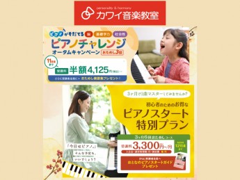 ■わさだタウン2街区1F/外周1丁目 カワイ音楽教室こんにちは♪カワイ音楽教室です。【秋の無料体験プラン・秋のおためしプラン】のご紹介です。だんだんと涼しくなる季節・・・そして芸術の秋ですね・・・習い事の中でも人気トップの「ピアノ」。この秋から、はじめてみませんか?無料体験・おためしレッスン受付中です♪☆おためし3回レッスン ピアノチャレンジ ≪2025年11月末まで≫~今大人気!1か月で簡単な曲が弾けるように・・・“はじめてのお子様”のための3回個人レッスン~お子様がピアノに興味を持つか不安・・・まずは、おためし個人レッスンから初めてみませんか?1か月間のおためし3回レッスンにより、お子様がピアノを続けていけるかを判断できます。60年以上のノウハウを詰め込んだオリジナルテキスト「サウンドツリー」でお子さまの成長にとって「何が必要か」を常に考えたレッスンを行います。●受講料…特別価格 4,125円さらに、おためしレッスン終了後、正規ご入会で入会金半額!☆3歳ソルフェージュ ≪2025年11月末まで≫3歳からピアノを始めたい方へ!初歩のピアノレッスンで音楽的な基礎を楽しく身につけます!●ご入会の方限定…入会金半額☆大人ピアノスタート特別プラン≪2025年12月末まで≫3か月で1曲マスターしてみませんか?3か月6回のお得なおためしレッスンです●受講料…3,300円/月 ※運営管理費 無料/月さらに、おためしレッスン終了後、正規ご入会金無料!受講者の方全員に「おとなのピアノスタートガイド」をプレゼント。ピアノコース以外にもバイオリンや声楽、いきいきピアノなどのグループコースも。是非一度カワイ音楽教室HPをご覧ください。 ※無料体験・おためしレッスンの申し込みは《カワイ音楽教室》WEBなら24時間受付中。※教室によって実施コースが異なる場合があります。詳しくはお問合せください。【お問合せ】 カワイ音楽教室 大分事務所TEL:0120‐74‐7009 [受付時間]火曜~土曜日 10:00~15:00