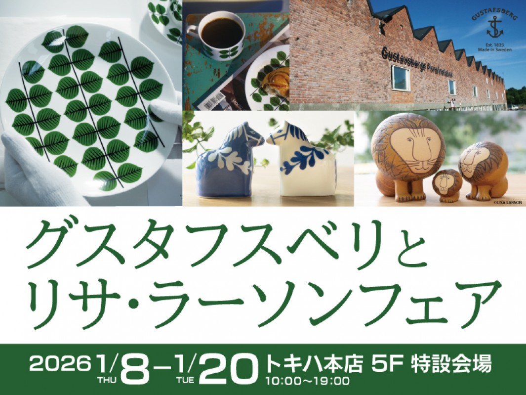 芸術家のウィルヘルム・コーゲやスティグ・リンドベリなど素晴らしいデザイナーが活躍しました。今回はグスタフスベリで人気のテーブルウェアと、スティグ・リンドベリに見いだされグスタフスベリで活躍したリサ・ラーソンのオブジェや雑貨を展示販売いたします。ぜひ会場にお越しください。