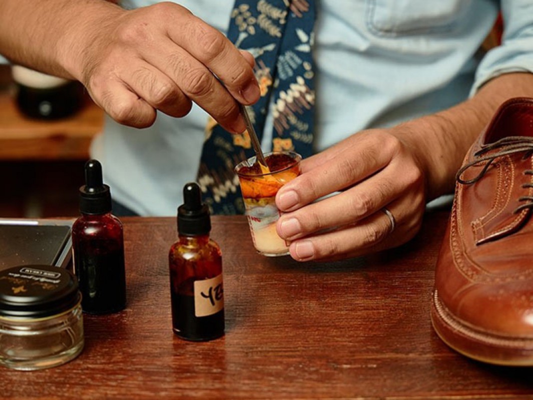 実演会ではお客様の革靴や「こんな色にしたい」というご要望に合わせて、カラーリストが目の前で色を調合。お手持ちの靴にぴったり合う色味やニュアンスを変えたい部分補色など、“あなただけの一色”を形にしていきます。
