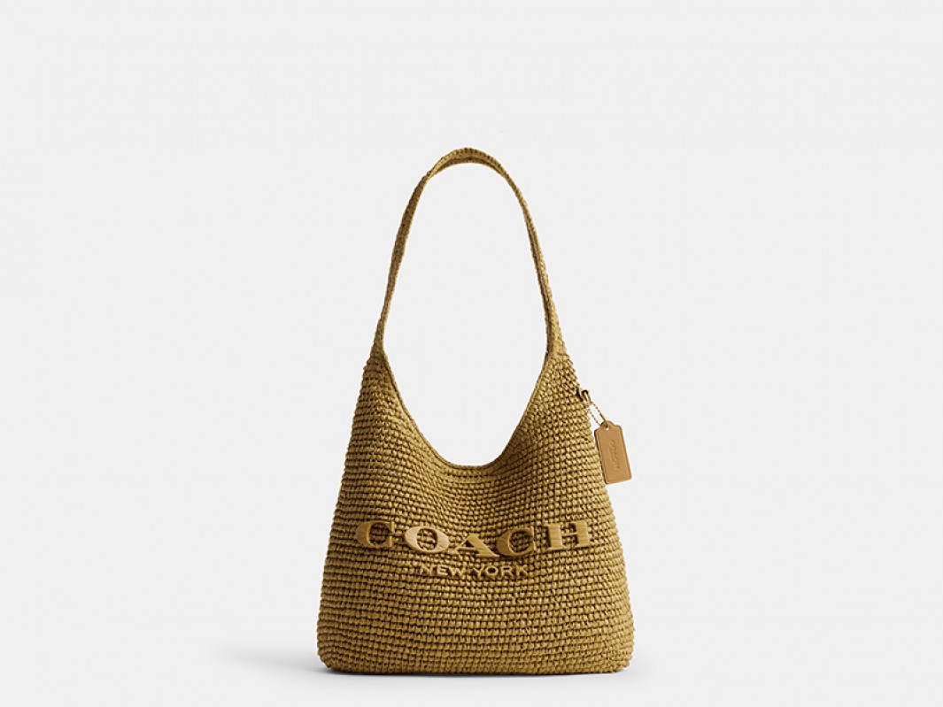 繊細に編んだストローにトーナル刺繍の「COACH」ロゴが生み出すさりげない華やぎが、この季節ならではの心地よいムードを引き出します。