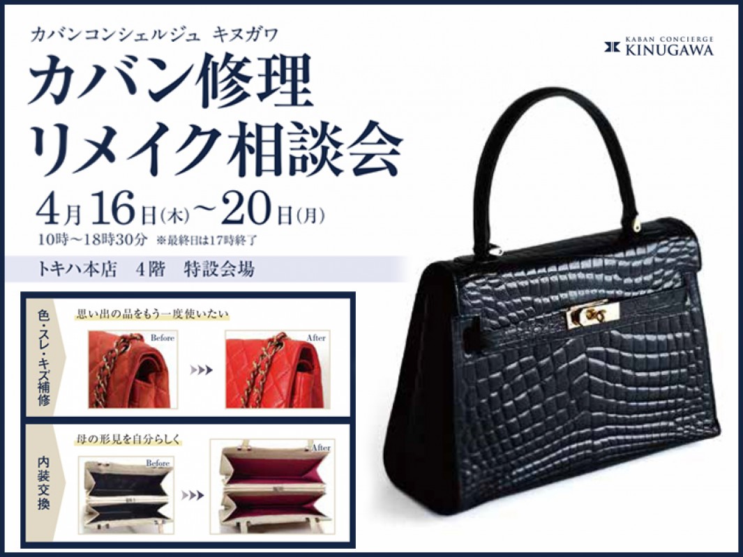■ 4/16(木)~20(月) ※最終日は17時終了■ 4F 特設会場かばんの産地「豊岡」より修理専門の職人をお招きして修理相談会を開催いたします。修理・色修正・リメイク・オーダーまで、100年の信頼と技術であなたの大切なかばんを末永くご愛用いただくためのお手伝いをいたします。高級ブランド品・クロコ・オーストリッチ・爬虫類等ブランド問わず承ります。【ご予約受付中】4月1日(水)~17日(金)ご予約のお申し込みはこちらから