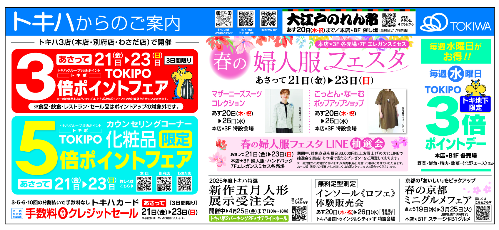 3月21日(金)▶23日(日)TOKIPO3倍ポイントフェア/化粧品限定TOKIPO5倍ポイントフェア/トキハカード手数料ゼロクレジットセール春の婦人服フェスタ3月21日(金)▶23日(日)ほか