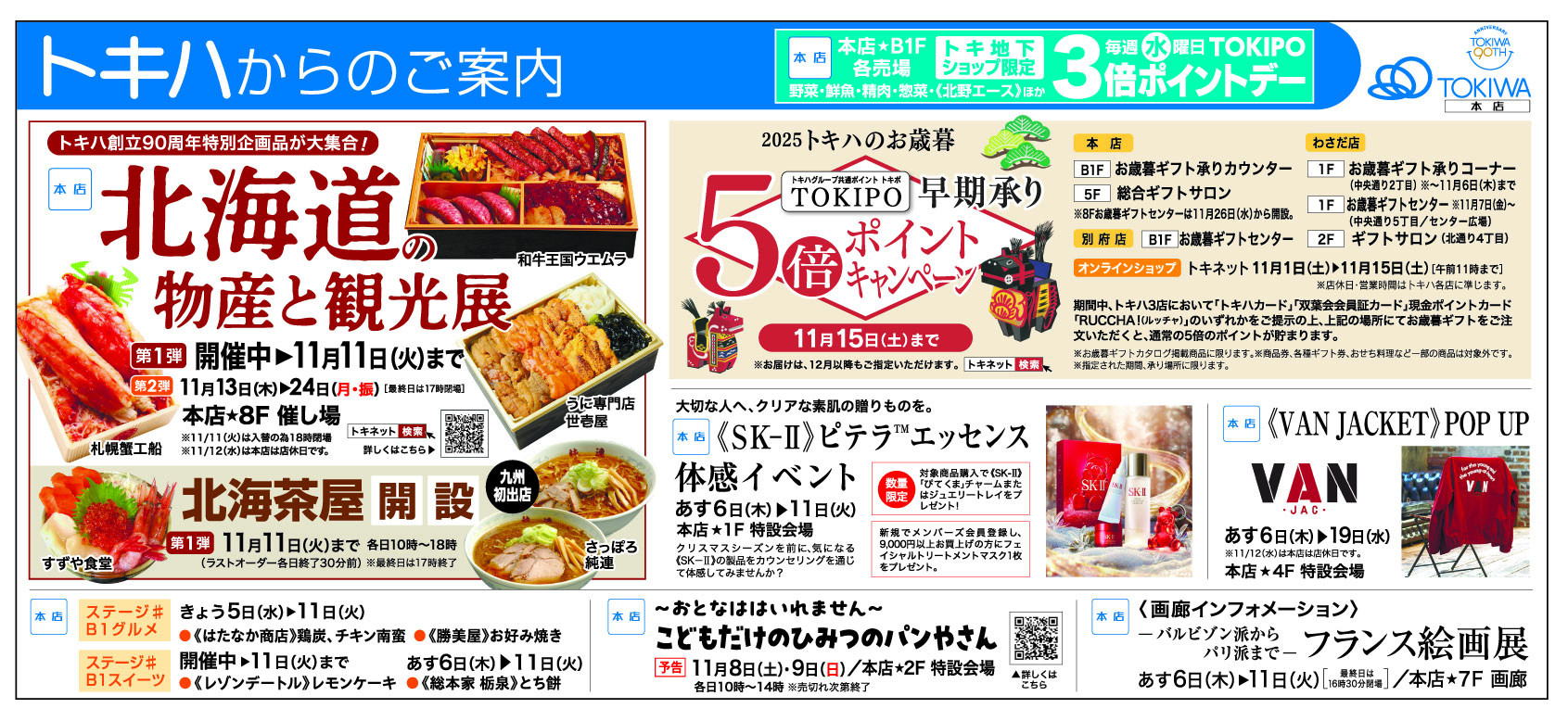 予告北海道の物産と観光展 第1弾:開催中▶11日(火)まで第2弾:11月13日(木)▶24日(月・振)※11/11(火)は入替の為18時閉場。※最終日は18時閉場 本店★8F 催し場 ほか