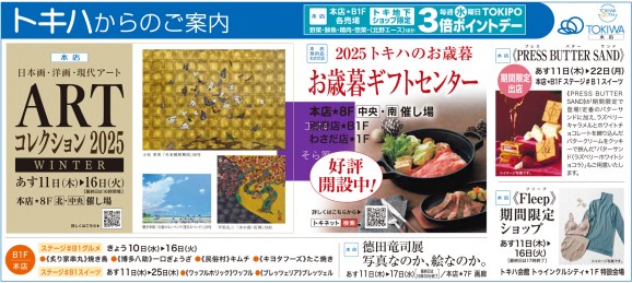 <特集:トキめきグルメ>エッセンハウスB1Fこだわりの宮崎牛ハンバーグ弁当(玉ねぎソース) 1,180円こだわりの宮崎牛ハンバーグ弁当(トマトチーズ) 1,380円こだわりの宮崎牛ハンバーグ弁当(大根おろしソース) 1,280円<特集:冬のあったかコーディネート>ミッシェルクラン(トキハ本店2F)ステンカラーコート ウール100% 60,500円ステンカラーコート ウール 100% [アイボリー] 60,500円パビリヨン(トキハ本店2F)ダナファヌル ペール製ベビーアルパカニット 24,200円ジェラート ピケ(トキハ本店2F)スキーベア プルオーバー 8,910円、スキーベア ロングパンツ 8,910円ジェラート スノーベア プルオーバー 8,580円ベア柄ネルロングパンツ 7,590円トリンプ(トキハ本店2F)ムーミン×スロギー ベスト 1点 6,930円ニットパンツ 1点 4,620円腹巻き付きニットパンツ 1点 4,950円ニットパンツ ロング 7,920円ハーフトップ 5,500円、ショーツ 2,420円THE NORTH FACE(トキハ本店4F)キャンプシエラショート 51,700円バルトロライトジャケット(ユニセックス) 68,200円デナリジャケット(キッズ 100~150cm) 15,400円マウンテンジャケット 66,000円