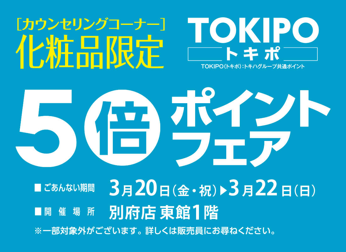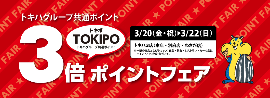 \TOKIPO(トキポ)3倍ポイントフェア/■ 3月20日(金・祝)~22日(日)■トキハ本店・別府店・わさだ店期間中、TOKIPO(トキポ)カードを提示してお買物いただくと、通常の3倍ポイントが付いてきます!おトクな期間となっておりますので、ぜひご利用ください!※食品・飲食・レストラン・セール品はポイントアップの対象外です。※TOKIPO(トキポ)カード:トキハカード、双葉会会員証カード、現金ポイントカード「RUCCHA!(ルッチャ)」\こちらも同時開催/