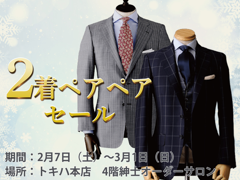■ 2月7日(土) ~ 3月1日(日)■ 4F 紳士オーダーサロン半期に一度の決算大特価!世界のブランド服地がお買い得のイベントです。細かい仕様までカスタマイズ出来るオーダースーツは一般的なパターンオーダーとは異なりポケット、裏地、ボタンと細部に至るまでご相談に応じます。更に2着作って頂くとお得なペアペアセールはもちろん、ご友人、ご家族と一緒でのお仕立てでもお得になります。ぜひこの機会にオーダーのプロによる細やかな採寸と接客でお好みの1着を仕立ててみませんか?<商品の一例>・ブランド服地オーダースーツ【2着】85,800円から※1着の場合は48,400円から
