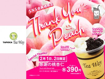 ■わさだタウン2街区1F/南通り7丁目 ティーウェイ■2月1日(日) ▶︎ 2月2日(月)いつもTeawayのタピオカドリンクをご愛顧いただき、ありがとうございます。当店は2月2日で18周年を迎えます。タピオカドリンク専門店として、長きに渡りやって来れたのもみなさまのおかげです。支えてくれているお客様、スタッフ、取引業者様に感謝しつつ、これからも美味しいタピオカをお届けできるよう、邁進してまいります。そんな感謝の気持ちを込め、2月1日より2日間、SNS会員様限定キャンペーンを開催!レジにてTeaway公式SNSのフォロー画面をご提示いただくと、2日間限定ドリンクを、サンキュー価格でご提供いたします。Teawayはこれからも変わらず心を込めてドリンクをお作りいたします。19周年目もどうぞよろしくお願いいたします。●感謝の桃杏仁(Rサイズ)…390円 ※1フォローにつき1杯まで