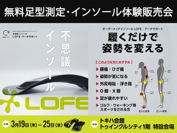 ■ 3月19日(木)~3月25日(水)※最終日は16:00終了■ 4F 南エスカレータ横 イベントスペースどんな靴にでも入る「 totonou (トトノウ) 」インソールフェアを開催いたします。足のアーチを効果的にサポートすることで、体のバランスを整える効果を期待できます。この機会にどうぞお立ち寄りください。