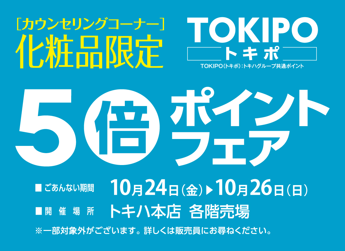 \トキハカード手数料ゼロクレジットセール/■トキハ本店・別府店・わさだ店■ 10/24(金) ~ 10/26(日)期間中、トキハカード・トキハカスタマーカードをご使用してお買物いただくと、「3・5・6・10回払いで、手数料が0円になります!」おトクな期間となっておりますので、ぜひご利用ください!(例)「税込10,000円」の商品を「6回払い」でご購入いただいた場合 初回 1,700円 2回 1,660円 : 6回 1,660円 計10,000円※一回のお支払い金額が1,000円(税込)以上が対象です。※手数料はトキハが負担いたします。\こちらも同時開催/