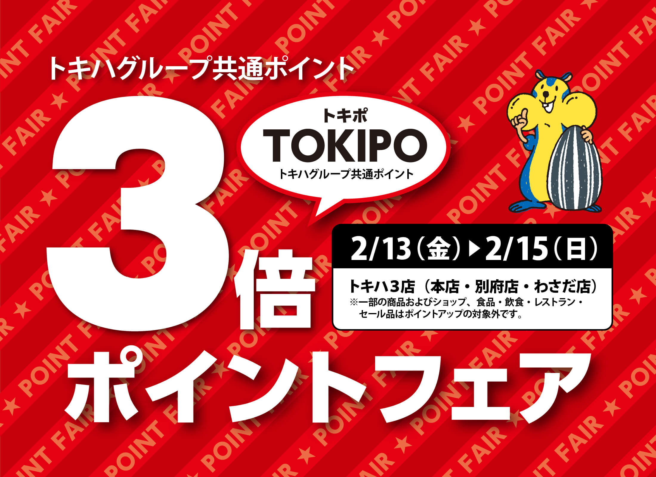 \TOKIPO(トキポ)3倍ポイントフェア/■ 2月13日(金) ~ 15日(日)■トキハ本店・別府店・わさだ店期間中、TOKIPO(トキポ)カードを提示してお買物いただくと、通常の3倍ポイントが付いてきます!おトクな期間となっておりますので、ぜひご利用ください!※食品・飲食・レストラン・セール品はポイントアップの対象外です。※TOKIPO(トキポ)カード:トキハカード、双葉会会員証カード、現金ポイントカード「RUCCHA!(ルッチャ)」\こちらも同時開催/