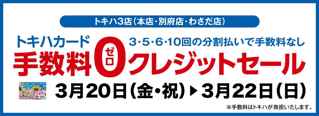 \TOKIPO(トキポ)3倍ポイントフェア/■ 3月20日(金・祝) ~ 22日(日)■ トキハ本店・別府店・わさだ店期間中、TOKIPO(トキポ)カードを提示してお買物いただくと、通常の3倍ポイントが付いてきます!おトクな期間となっておりますので、ぜひご利用ください!※食品・飲食・レストラン・セール品はポイントアップの対象外です。※TOKIPO(トキポ)カード:トキハカード、双葉会会員証カード、現金ポイントカード「RUCCHA!(ルッチャ)」\トキハカード手数料ゼロクレジットセール/■3月20日(金・祝) ~ 22日(日)■トキハ本店・別府店・わさだ店期間中、トキハカード・トキハカスタマーカードをご使用してお買物いただくと、「3・5・6・10回払いで、手数料が0円になります!」おトクな期間となっておりますので、ぜひご利用ください!(例)「税込10,000円」の商品を「6回払い」でご購入いただいた場合 初回 1,700円 2回 1,660円 : 6回 1,660円 計10,000円※一回のお支払い金額が1,000円(税込)以上が対象です。※手数料はトキハが負担いたします。