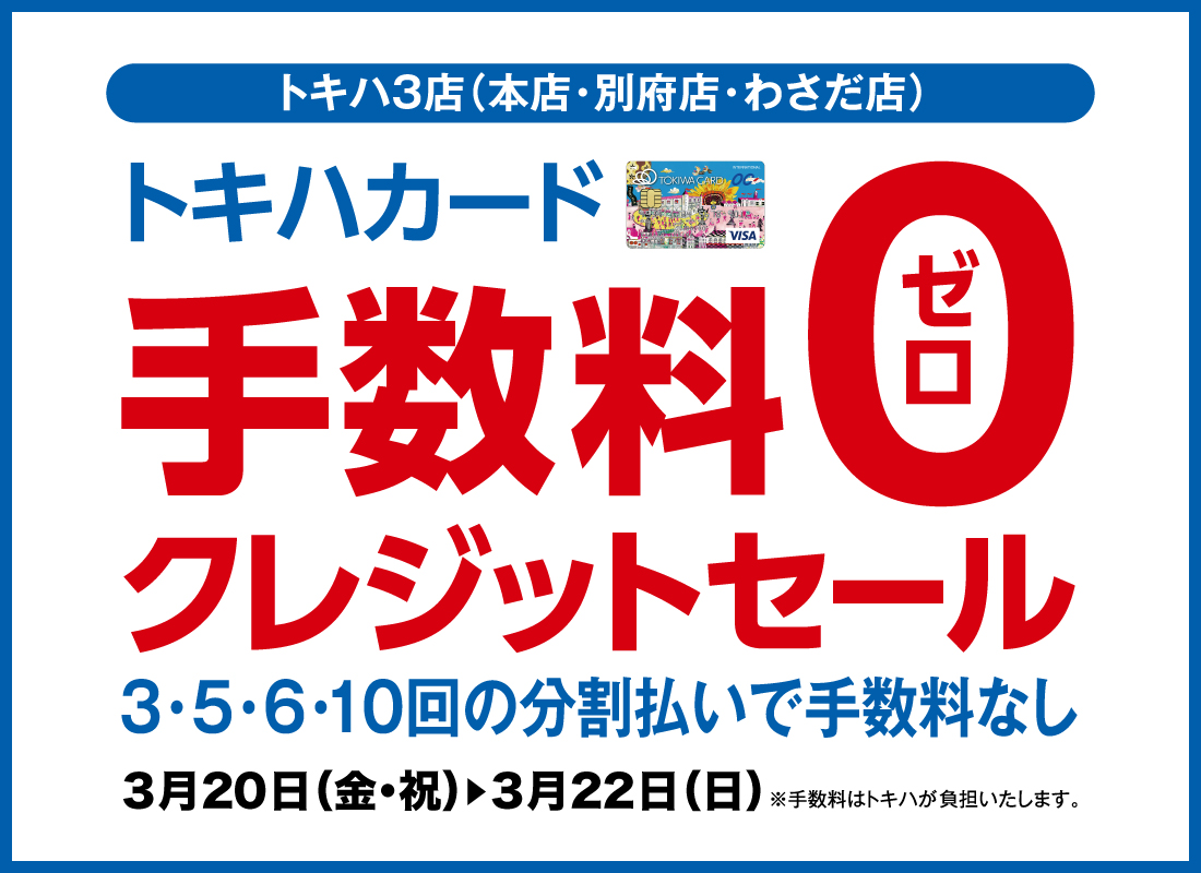 \トキハカード手数料ゼロクレジットセール/■ 3月20日(金・祝)~22日(日)■トキハ本店・別府店・わさだ店期間中、トキハカード・トキハカスタマーカードをご使用してお買物いただくと、「3・5・6・10回払いで、手数料が0円になります!」おトクな期間となっておりますので、ぜひご利用ください!(例)「税込10,000円」の商品を「6回払い」でご購入いただいた場合 初回 1,700円 2回 1,660円 : 6回 1,660円 計10,000円※一回のお支払い金額が1,000円(税込)以上が対象です。※手数料はトキハが負担いたします。\こちらも同時開催/