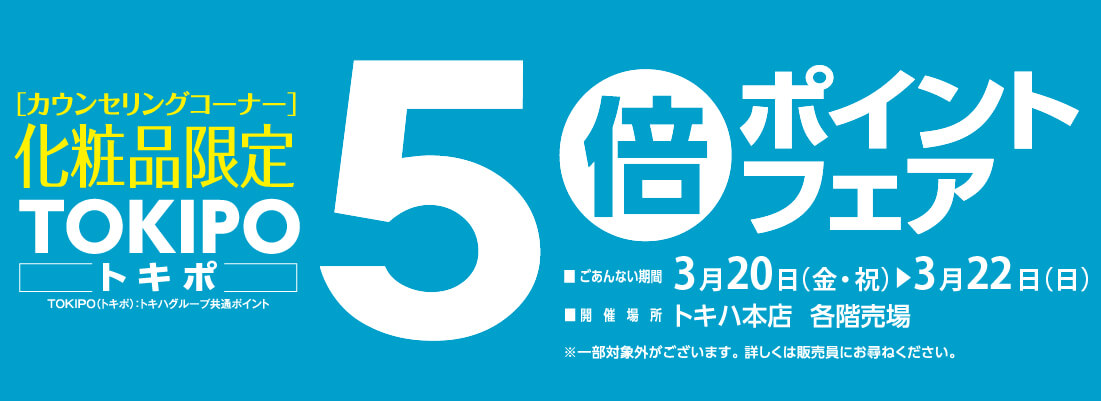 \TOKIPO(トキポ)3倍ポイントフェア/■ 3月20日(金・祝)~22日(日)■トキハ本店・別府店・わさだ店期間中、TOKIPO(トキポ)カードを提示してお買物いただくと、通常の3倍ポイントが付いてきます!おトクな期間となっておりますので、ぜひご利用ください!※食品・飲食・レストラン・セール品はポイントアップの対象外です。※TOKIPO(トキポ)カード:トキハカード、双葉会会員証カード、現金ポイントカード「RUCCHA!(ルッチャ)」\こちらも同時開催/