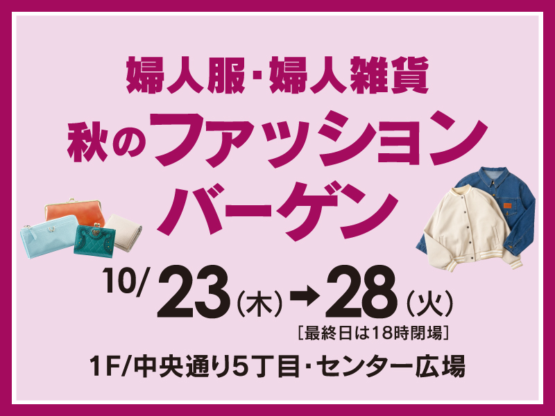 ■わさだタウン2街区1F/中央通り5丁目 センター広場■10月23日(木) ▶︎ 10月28日(火) ※最終日は18時閉場センター広場にて「婦人服・婦人雑貨 秋のファッションバーゲン」を開催!婦人ニットやジャケット、ハンドバッグにカジュアルシューズまで、特別価格にて取り揃えております。この機会にぜひお越しください。~商品の一例~ ※すべてイメージ写真です。▲《ミデゥー》●ニット…各1点 6,600円均一 ●ダウンジャケット…14,850円▲《Deux-Places》●フェイクファーポンチョ…20点限り 3,300円▲《青山》デザインジャケット(デザイン各種)…各 9,790円▲〈有名ブランド〉財布(デザイン各種)…5,500円から▲婦人カジュアルシューズ(デザイン各種、サイズ取合わせ)…5,500円から▲婦人ハンドバッグ(デザイン各種)…5,500円から