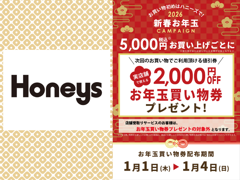 ■わさだタウン2街区2F/中央通り1丁目 ハニーズハニーズでは、冬に最適な「ハニぽか」シリーズの商品をはじめ、アウターやニットを豊富に取り揃えております。1月1日(木・祝) ▶︎ 1月4日(日)の期間、税込5,000円以上お買上げごとに、お年玉買い物券(2,000円OFF)をプレゼントいたします!お年玉買い物券は2月28日(土)までご利用いただけます。※オンラインショップではご利用いただけませんのでご了承ください。