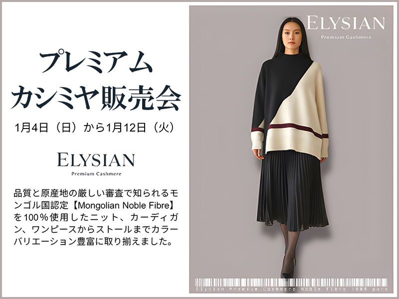 ■ 1月4日(日) ~ 1月12日(火)■ 3F 南エスカレータ横世界のカシミヤ原材料総供給量の約5割を占める世界最大の生産国、モンゴル。「メイド・イン・モンゴル」のカシミヤ製品と、最高級の原材料と日本の伝統技術を融合させ、ふんわりとした極上の肌触りを実現した「メイドイン・ジャパン」の”モンゴリアン・ノーブル・ファイバー”認証取得のカシミヤ及びヤクの製品をご提案いたします。どうぞこの機会にお立ち寄りください。