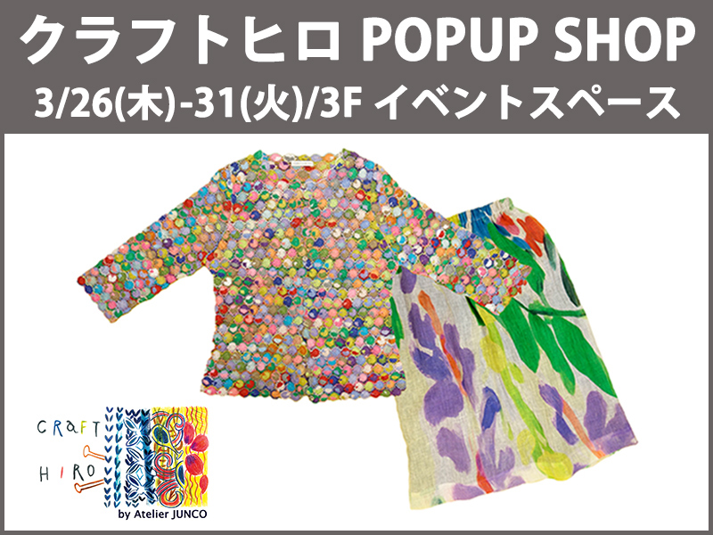 ■ 3月26(木)~3月31日(火)■ 3F イベントスペース鎌倉発のニットショップ。時を超え袖を通すたびに風合いが増す手仕事でつくられたお洋服は色とりどりの糸を使いとてもカラフル。期間限定で展示販売いたしますので、どうぞこの機会にお立ち寄りください。