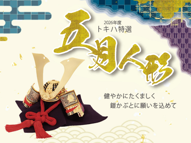 ■ 3月16日(月) ~ 4月30日(木)■ 5F 特設会場2026年5月に初めて端午の節句を迎えるお子様に向けて、新作五月人形展示受注会を開催しております。伝統的な鎧平飾り、片付けに便利な収納型兜平飾りなど豊富に品揃えいたします。またお部屋の中に飾れる室内用鯉飾りや、おうちの外に飾る鯉のぼりもご用意いたしております。大切なお子様、お孫様のために素敵な一品を、ぜひトキハ本店で見つけてください。▼デジタルカタログはこちら