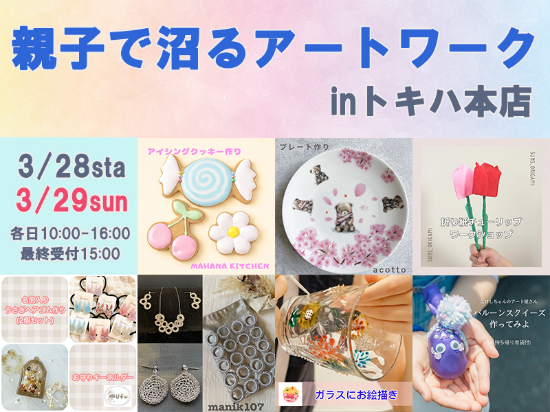 ■ 3月28日(土)・29日(日)・各日:10:00~16:00(15:00最終受付)・所要時間:約1時間■ 6F 南エスカレータ横 特設会場大分で活躍中の作家による親子で楽しめるワークショップを開催♪どうぞこの機会にお立ち寄りください。【ワークショップ詳細】■ 3月28日(土)・29日(日)開催≪mahana kitchen≫・アイシングクッキー 3枚/2,200円/対象:3歳~≪acotto≫・プレート作り/4,400円/対象:3歳~≪ufu..≫・うさぎヘアゴム作り 2個セット/2,600円/対象4歳~・お守りキーホルダー/2,000円/対象3歳~≪きめんどう≫・ガラスにお絵描き/2,200円/対象:3歳~■ 3月28日(土)のみ≪こけしちゃんのアート屋さん≫・バルーンスクイーズ/880円/対象:2歳~■ 3月29日(日)のみ≪さんずおりがみ≫・折り紙チューリップ/1,200円/対象:3歳~【販売のみ】≪manik107≫内容:アクセサリー・雑貨※ワークショップの内容は変更になることもございます。あらかじめご了承ください。