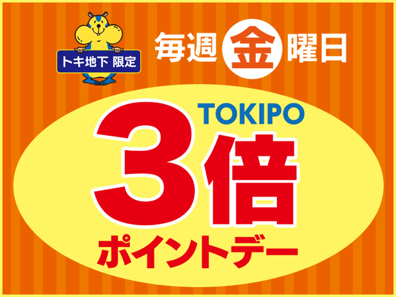 ■ B1F 惣菜・生鮮売場毎週金曜日はB1Fの惣菜・生鮮でTOKIPOポイントが3倍付与されます。どうぞこの機会にお立ち寄りください。<対象店舗>・秀栄丸・幸神・九州屋・魚屋丸九・丸福水産・肉処 きしもと・お肉の専門店 あきら・エッセンハウス・お肉屋さんのお惣菜 河原・うなぎの本田や・竹田丸福・梅乃松庵